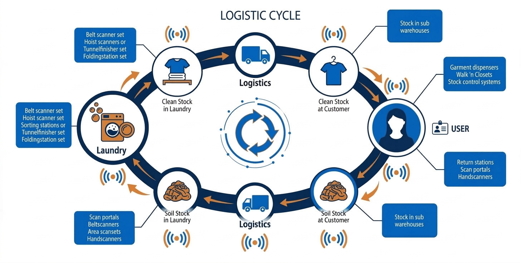 Con RFID, todos los movimientos de ropa se registran automáticamente. Se sabe en todo momento dónde está cada prenda: en uso, en lavandería o almacenada.
